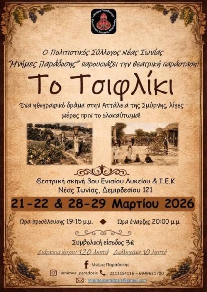 Θεατρική παράσταση με τίτλο «Το τσιφλίκι» θα παρουσιάσει στις 21, 22, 28 και 29 Μαρτίου η θεατρική ομάδα του Πολιτιστικού Συλλόγου Νέας Ιωνίας «Μνήμες Παράδοσης».