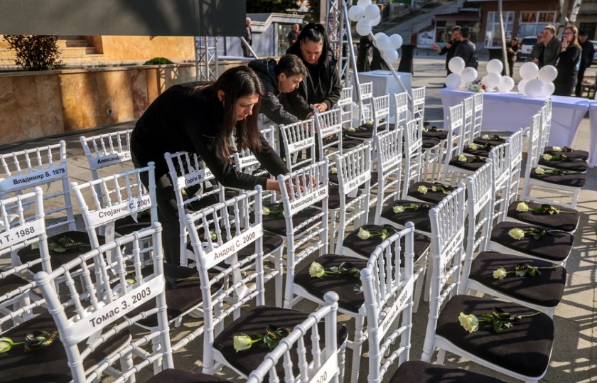 Καρέκλες με τα ονόματα των θυμάτων κι ένα λευκό τριαντάφυλλο επάνω στην καθεμία στήθηκαν για την επιμνημόσυνη δέηση στην πρώτη επέτειο από το τραγικό δυστύχημα (φωτ.: EPA/Georgi Licovski)