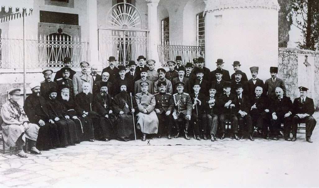 Ο μητροπολίτης Τραπεζούντας Χρύσανθος, Ρώσοι αξιωματικοί του τσαρικού στρατού, και Οθωμανοί αξιωματούχοι, το 1916, στην Τραπεζούντα (πηγή: ozhanozturk.com)