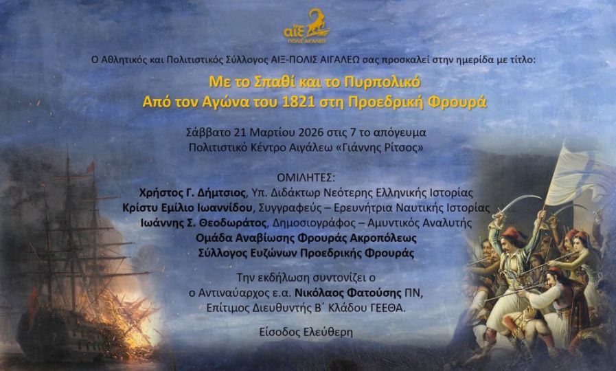 Ο Αθλητικός και Πολιτιστικός Σύλλογος ΑΙΞ-ΠΟΛΙΣ ΑΙΓΑΛΕΩ διοργανώνει το Σάββατο 21 Μαρτίου, στις 19:00, ημερίδα με τίτλο Με το σπαθί και το πυρπολικό – Από τον αγώνα του 1821 στην Προεδρική Φρουρά, στο Πολιτιστικό Κέντρο Αιγάλεω «Γιάννης Ρίτσος».