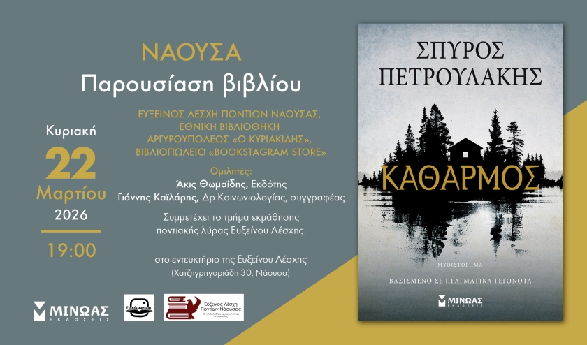Την παρουσίαση του νέου βιβλίου Καθαρμός του Σπύρου Πετρουλάκη οργανώνει την Κυριακή 22 Μαρτίου η Εύξεινος Λέσχη Ποντίων Νάουσας – Εθνική Βιβλιοθήκη Αργυρουπόλεως «Ο Κυριακίδης» σε συνεργασία με το βιβλιοπωλείο Bookstagram και τις Εκδόσεις ΜΙΝΩΑΣ. Το έργο του καταξιωμένου συγγραφέα, που έχει συνδεθεί και με την επιτυχία του Σασμού, φέρνει στο φως μια ιστορία όπου το παρελθόν, η μνήμη και οι ρίζες διασταυρώνονται με τρόπο έντονο και συγκινητικό.