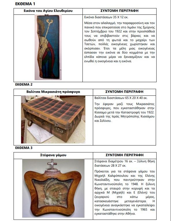 Τα εκθέματα είναι μια  εικόνα του Αγίου Ελευθερίου, μια βαλίτσα πρόσφυγα και στέφανα γάμου.