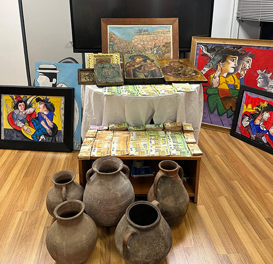 Κατά την επιχείρηση της ΕΛΑΣ βρέθηκαν και κατασχέθηκαν 190.000 ευρώ, καθώς και περισσότερα από 300 έργα, που σύμφωνα με την πρώτη αξιολόγηση από τους ειδικούς, είναι σχεδόν όλα πλαστά. Μόλις 7 εκτιμάται πως είναι γνήσια.