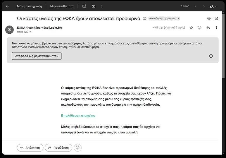 Τελευταίο, και πιο σημαντικό, ο ίδιος ο αποστολέας: Αν το μήνυμα προερχόταν όντως από τον e-ΕΦΚΑ, σίγουρα δεν θα το έστελνε κάποιος από τη διεύθυνση learn2sell.com.br, δηλαδή από τη Βραζιλία!
