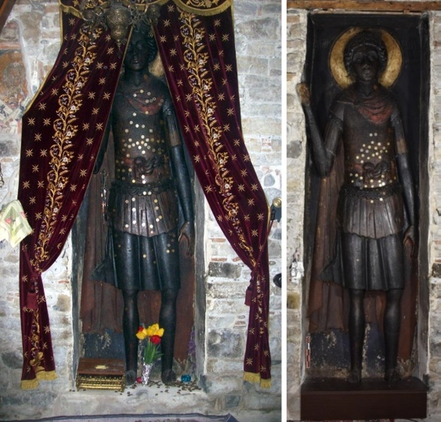 Το ξυλόγλυπτο άγαλμα του αγίου Γεωργίου Έχει κατασκευαστεί από μονοκόμματο ξύλο καρυδιάς με πρόσθετο τμήμα στον πήχη του δεξιού χεριού (φωτ.: Δήμος Καστοριάς)