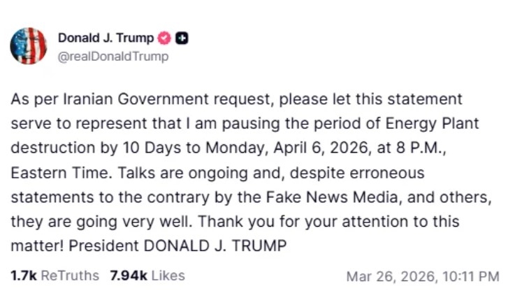 «Κατόπιν αιτήματος της ιρανικής κυβέρνησης… αναστέλλω την καταστροφή σταθμών παραγωγής ενέργειας (στο Ιράν) για 10 ημέρες, έως τη Δευτέρα 6 Απριλίου 2026 στις 8 μ.μ. (ώρα Ανατολικής Ακτής στις ΗΠΑ, 3 τα ξημερώματα της Τρίτης 7 Απριλίου στην Ελλάδα).
