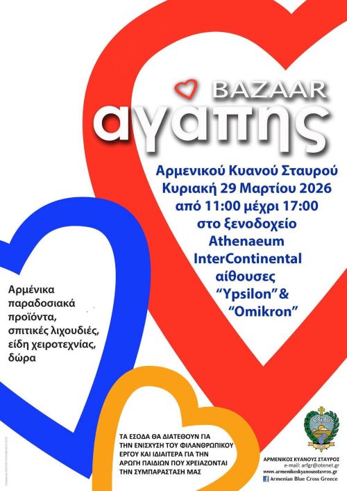 Αγαπημένα ταχινοπιτάκια, λαχταριστά σαραϊλί και αφράτα τυροπιτάκια με χειροποίητη ζύμη, όλα μαμαδίστικα και φρεσκοπαρασκευασμένα με αγνά υλικά από τις έμπειρες εθελόντριες του Αρμενικού Κυανού Σταυρού Ελλάδος θα έχουν τη χαρά να γευτούν όσοι δώσουν το παρών, την Κυριακή 29 Μαρτίου, στο Bazaar Αγάπης στις αίθουσες Omicron και Ypsilon του ξενοδοχείου InterContinental.