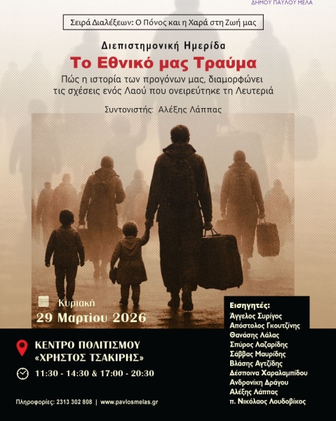 Ο δήμος Παύλου Μελά διοργανώνει, την Κυριακή 29 Μαρτίου, διεπιστημονική ημερίδα με τίτλο Το Εθνικό μας Τραύμα, στο Κέντρο Πολιτισμού «Χρήστος Τσακίρης».