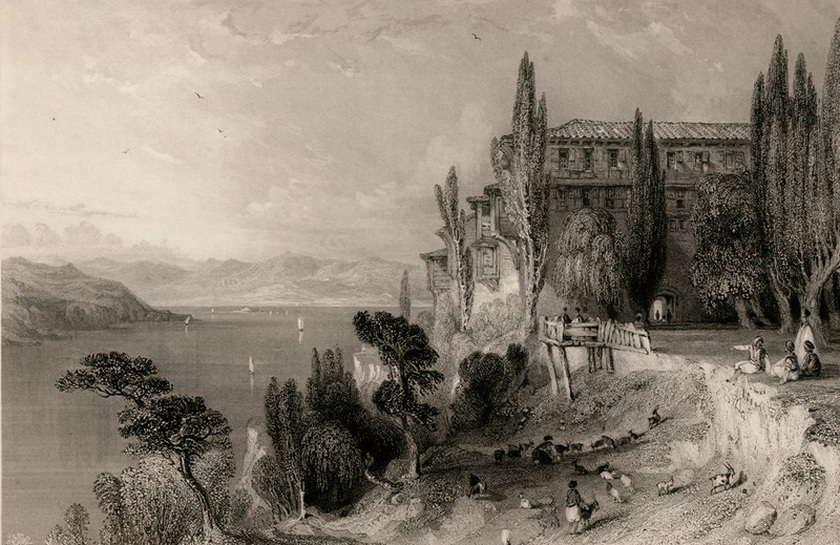Η μονή του Αγίου Γεωργίου του Κρημνού στη Χάλκη σε σχέδιο του Τhomas Allom από το 1836 (φωτ.: Ελληνική Βιβλιοθήκη – Κοινωφελές Ίδρυμα Αλέξανδρος Σ. Ωνάσης)