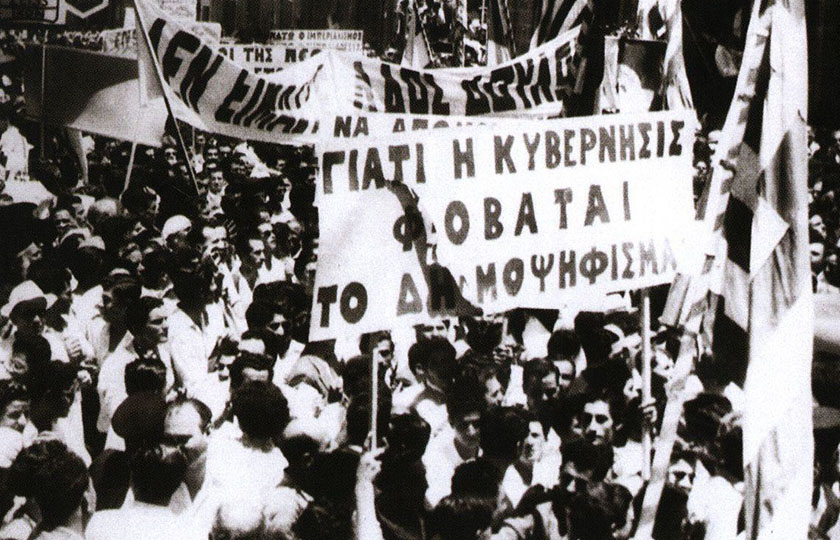 Ο κυπριακός λαός διαδηλώνει υπέρ του ενωτικού δημοψηφίσματος (πηγή: eoka.org.cy)