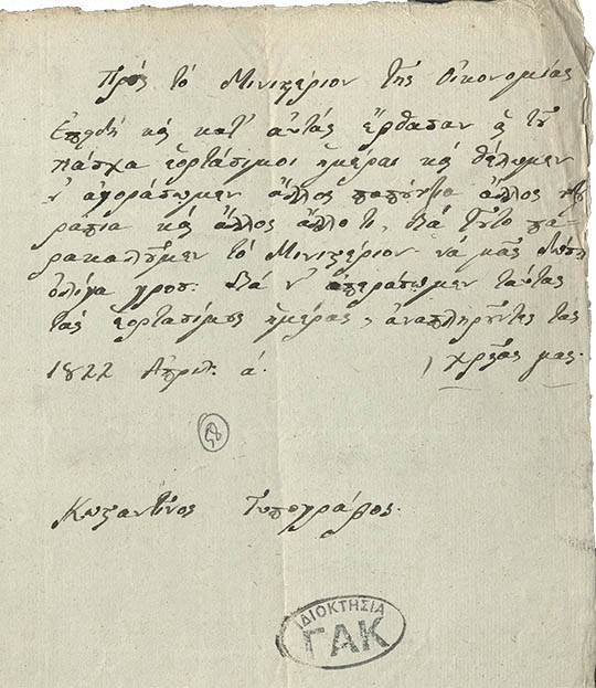 «Επειδή και κατ’ αυτάς έφτασαν αι του Πάσχα εορτάσιμοι ημέραι και θέλομεν ν’ αγοράσωμεν άλλος παπούτσια, άλλος τζουράπια και άλλος άλλο τι, δια τούτο παρακαλούμεν το Μινιστέριον να μας δώση ολίγα γρόσια δια ν’ απεράσωμεν ταύτας τας εορτασίμους ημέρας, αναπληρούντες τας χρείας μας».