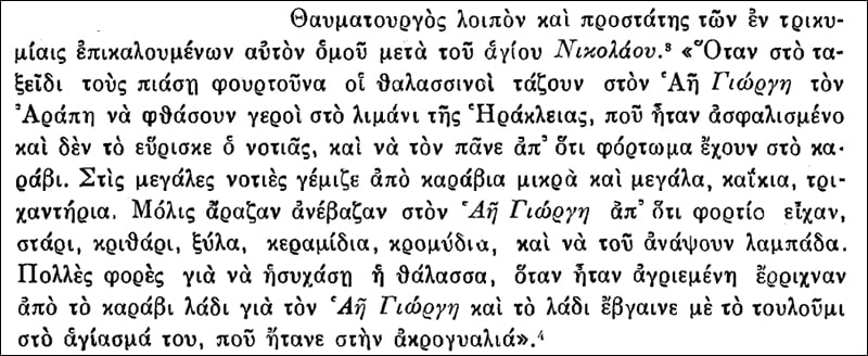 Προς την Συρίαν μάλλον ή την Καππαδοκίαν συνδέεται ο πολιούχος ούτος της Ηρακλείας άγιος, όστις καθ’ όλην την Θράκην είναι γνωστός υπό το όνομα «Αράπης», διότι είναι αναγεγλυμμένος επί μέλανος γρανίτου, όπως ακριβώς τα αιγυπτιακά μνημεία. Κατά την παράδοσιν ευρέθη η εικών προ 230 ετών επί τίνος βράχου εν τη παραλία της Ηρακλείας, ότε και μετεφέρθη εις το παρεκκλήσιον του αγ. Νικολάου, εν η θέσει ο νυν ναός υψούται εις τιμήν του τροπαιοφόρου, η μεγαλοπρεπής μητρόπολις εις το ΒΑ άκρον τής πόλεως. […] Παρίσταται έφιππος εν κινήσει φορών περισκελίδα και χλαμύδα και κρατών δια της δεξιάς μεν τον χαλινόν, διά δε της αριστεράς σπάθας δύο μεγάλας.