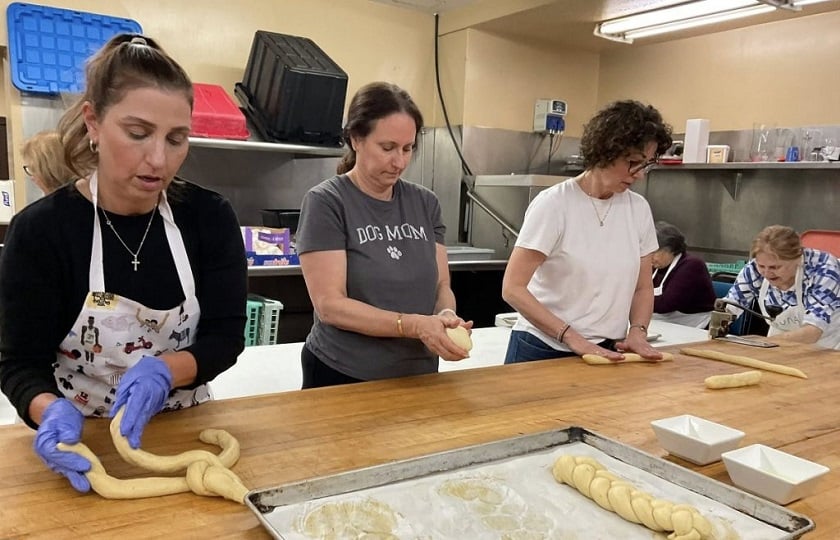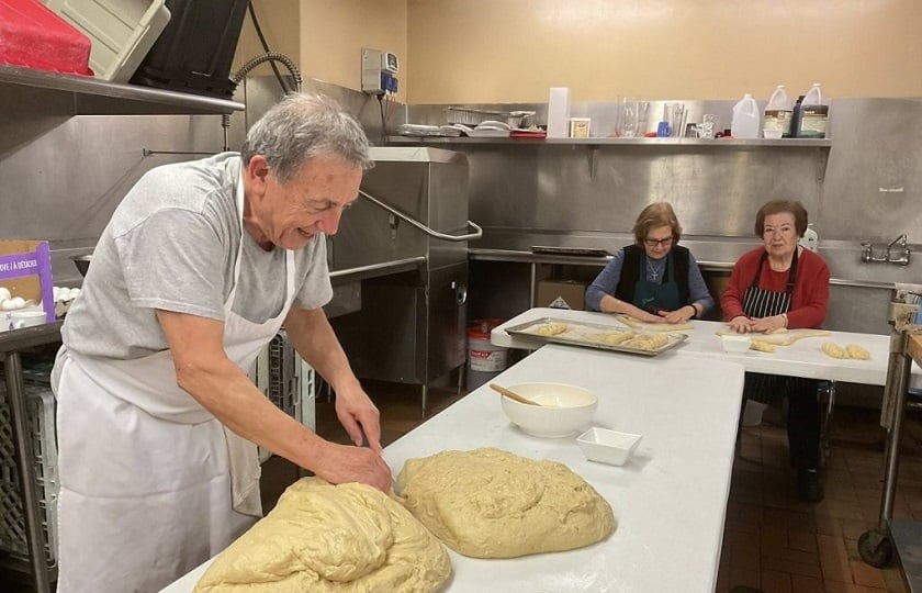 Εθελόντριες της παροικίας, με τη συμβολή κυρίως των κυριών της Φιλοπτώχου του Ιερού Ναού Αγίου Γεωργίου, φρόντισαν και φέτος να ετοιμάσουν παραδοσιακά γλυκίσματα όπως τσουρέκια και κουλουράκια.