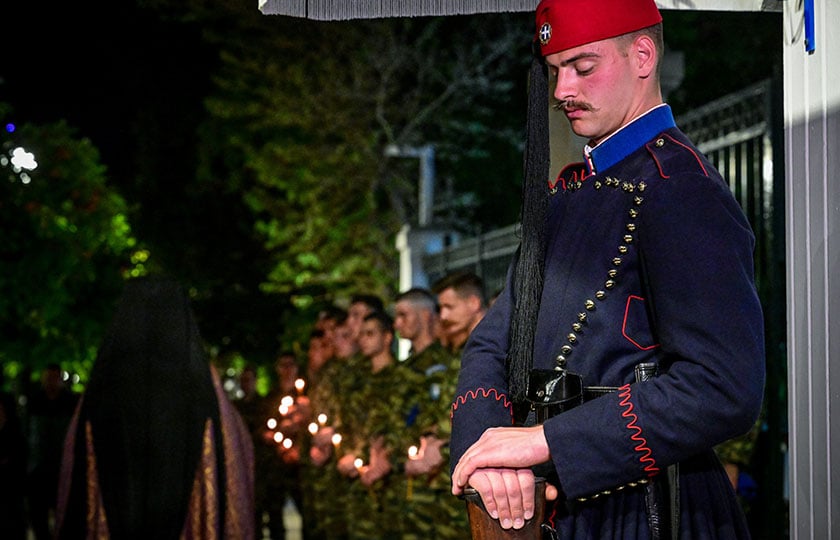 Eύζωνας στη χαρακτηριστική στάση «επί των όπλων» ενώ περνά από μπροστά του ο Eπιτάφιος (φωτ.: EUROKINISSI / Τατιάνα Μπόλαρη)