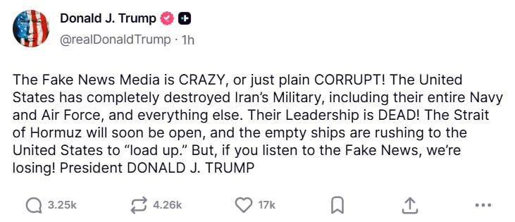«Τεράστιος αριθμός εντελώς άδειων πετρελαιοφόρων […] κατευθύνονται αυτή τη στιγμή προς τις ΗΠΑ για να φορτώσουν το καλύτερο και “γλυκύτερο” πετρέλαιο και φυσικό αέριο», ανέφερε σε ανάρτησή του, την ώρα που στο Ισλαμαμπάντ βρίσκονται σε εξέλιξη οι κρίσιμες συνομιλίες με το Ιράν για τον τερματισμό του πολέμου.