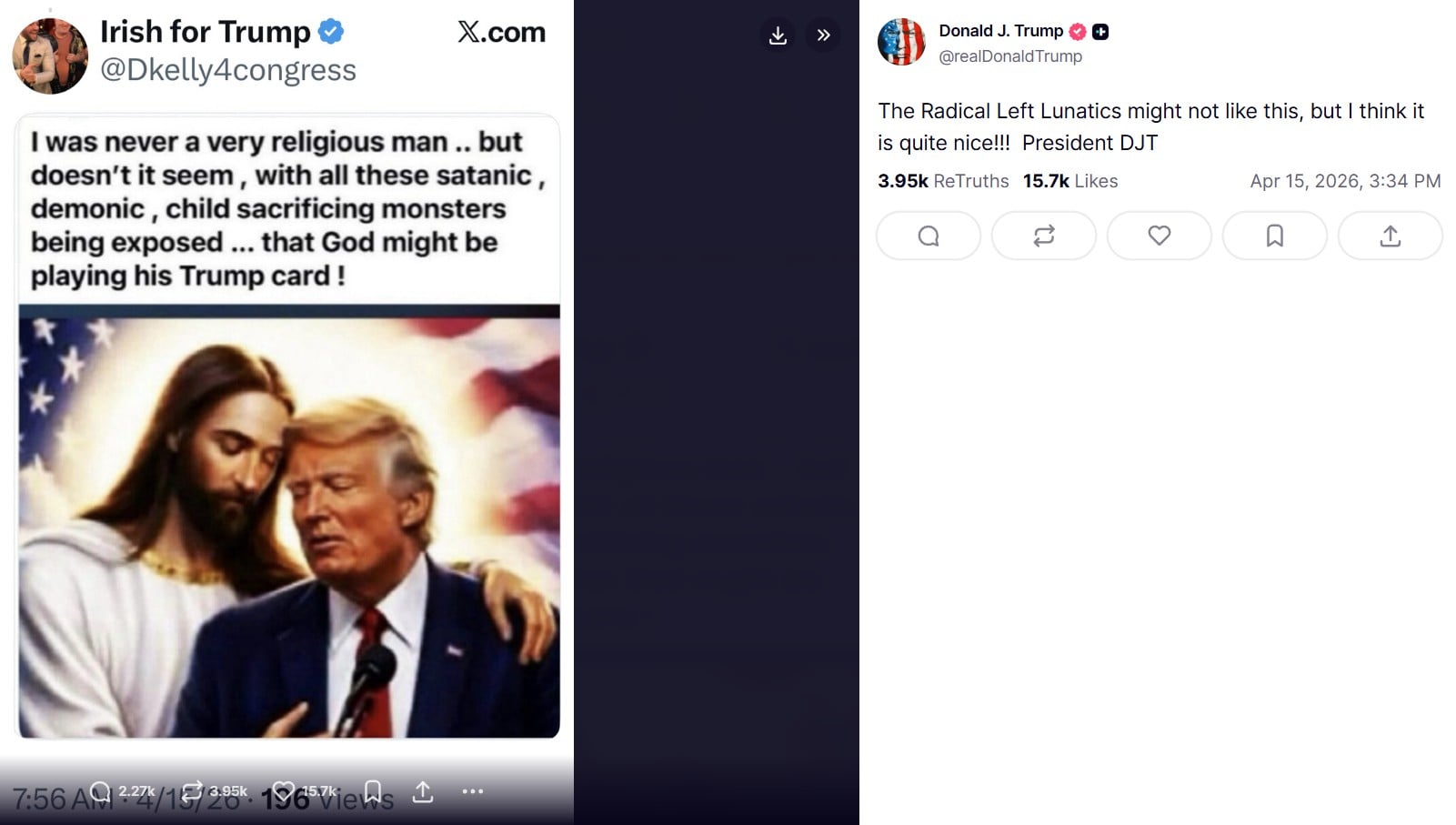 Η εικόνα, που αναδημοσιεύτηκε στον λογαριασμό του στο Truth Social, δείχνει τον Αμερικανό πρόεδρο με τα μάτια κλειστά να γέρνει προς τον Ιησού, μπροστά από μικρόφωνο και με φόντο την αμερικανική σημαία.