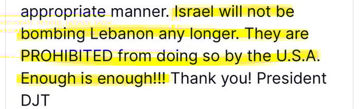 «Το Ισραήλ δεν θα βομβαρδίζει πλέον τον Λίβανο. Οι ΗΠΑ τους απαγορεύουν να το κάνουν. Φτάνει πια!!!» έγραψε σε ανάρτησή του στο Truth Social.