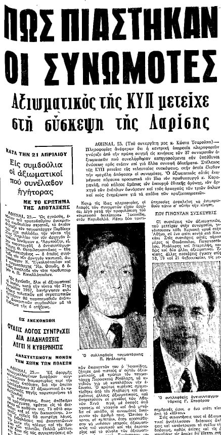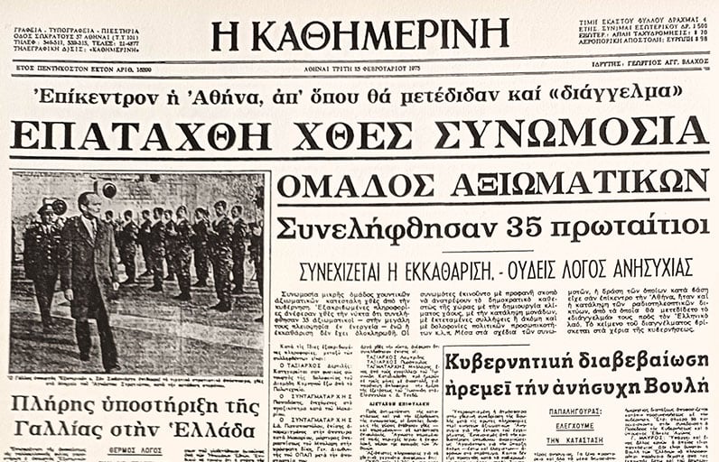 • «Επατάχθη χθες συνωμοσία ομάδος αξιωματικών / Συνελήφθησαν 35 πρωταίτιοι» «χτυπάει» στο δικό της πρωτοσέλιδο η Καθημερινή με «καπέλο» «Επίκεντρον η Αθήνα απ΄ όπου θα μετέδιδαν και διάγγελμα» και πλαϊνό τρίστηλο «Κυβερνητική διαβεβαίωση ηρεμεί την ανήσυχη Βουλή».
