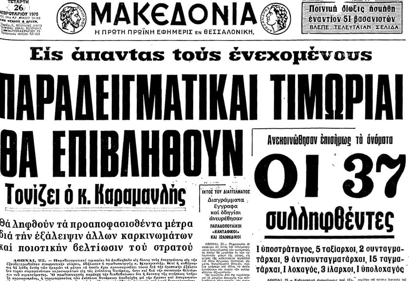 Πρωτοσέλιδο της εφημερίδας Μακεδονία στις 26 Φεβρουαρίου 1975, με αναφορά στο λεγόμενο «Πραξικόπημα της πιτζάμας» (φωτ.: Εθνική Βιβλιοθήκη της Ελλάδος / Ψηφιακό Αρχείο Εφημερίδων και Περιοδικού Τύπου)