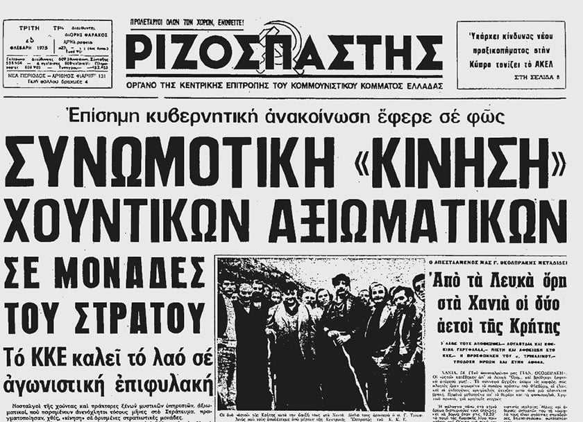 • «Συνωμοτική κίνηση χουντικών αξιωματικών σε μονάδες του στρατού» με «καπέλο» «Επίσημη κυβερνητική πηγή έφερε στο φως» κυκλοφορεί στο πρωτοσέλιδό του ο Ριζοσπάστης.