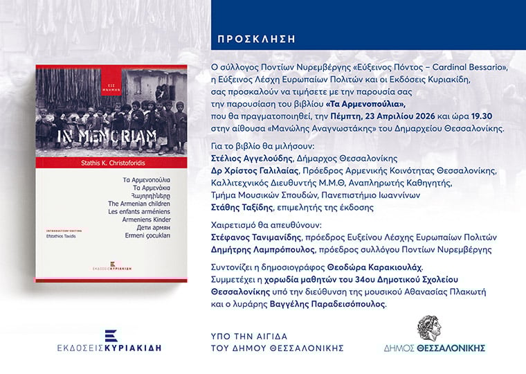Τώρα, με αφορμή την 111η επέτειο από τη Γενοκτονία των Αρμενίων, αλλά και τη συμπλήρωση 50 ετών από την ίδρυσή του, ο Σύλλογος Ποντίων Νυρεμβέργης και η Εύξεινος Λέσχη Ευρωπαίων Πολιτών θα παρουσιάσουν το βιβλίο στην αίθουσα «Μανώλης Αναγνωστάκης» του Δημαρχείου Θεσσαλονίκης (Πέμπτη 23 Απριλίου, στις 19:30).
