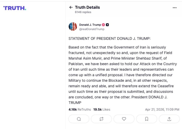 Διευκρινίζοντας πως διέταξε τις αμερικανικές ένοπλες δυνάμεις «να συνεχίσουν τον αποκλεισμό» των ιρανικών λιμανιών, ο πρόεδρος των ΗΠΑ υπογραμμίζει πως θα παρατείνει την «εκεχειρία έως ότου κατατεθεί η πρόταση (του Ιράν) και ολοκληρωθούν οι συνομιλίες, με τον έναν ή τον άλλον τρόπο».
