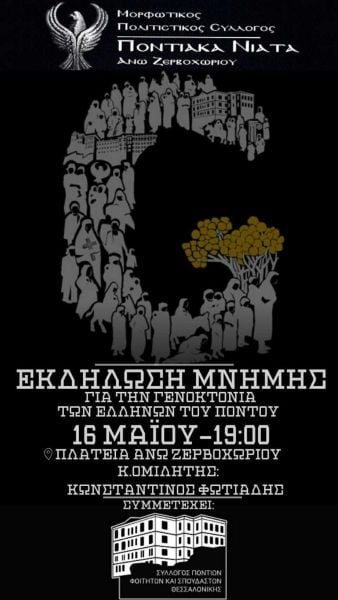 Ο Μορφωτικός Πολιτιστικός Σύλλογος «Ποντιακά Νιάτα» Άνω Ζερβοχωρίου διοργανώνει το Σάββατο 16 Μαΐου, στις 19:00, εκδήλωση τιμής στη μνήμη των θυμάτων της ποντιακής Γενοκτονίας, στο Μνημείο του χωριού.
