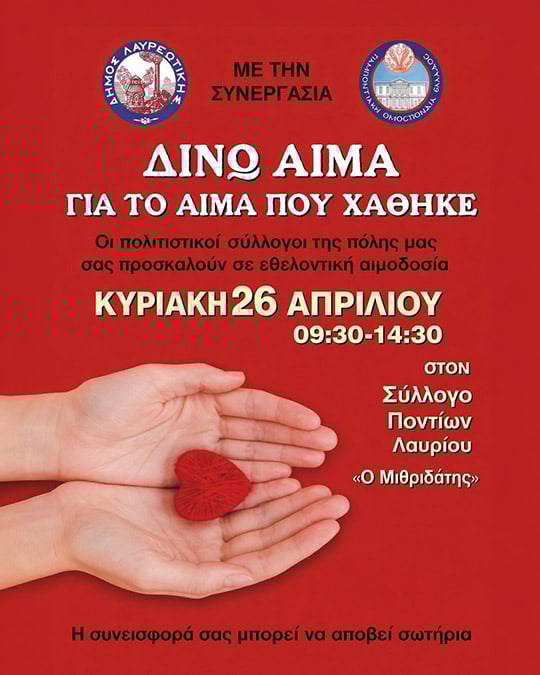 Η αιμοδοσία θα πραγματοποιηθεί την Κυριακή 26 Απριλίου, από τις 9:30 έως τις 14:30, στο Σύλλογο Ποντίων Λαυρίου «Ο Μιθριδάτης».