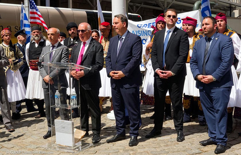 Επιβλητική και πλήρης συμβολισμών ήταν η τελετή έπαρσης της γαλανόλευκης στο πάρκο Bowling Green του Μανχάταν, που έλαβε χώρα το μεσημέρι (τοπική ώρα) της Παρασκευής 24 Απριλίου, παρουσία του Προέδρου της Βουλής Νικήτα Κακλαμάνη, βουλευτών, του υφυπουργού Παιδείας Κωνσταντίνου Βλάση, του διοικητή του Αγίου Όρους Αλκιβιάδη Στεφανή, και πολλών εκπροσώπων της Περιφερειακής και Τοπικής Αυτοδιοίκησης.