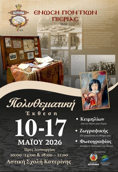 Με κεντρικό σύνθημα «Μια πατρίδα που αναπνέει μέσα από τη μνήμη μας», η Ένωση Ποντίων Πιερίας προσκαλεί το κοινό στην 5η Πολυθεματική Έκθεση Κειμηλίων, Ζωγραφικής και Φωτογραφίας, ένα σπουδαίο πολιτιστικό και ιστορικό γεγονός αφιερωμένο στη Γενοκτονία του Ποντιακού Ελληνισμού.