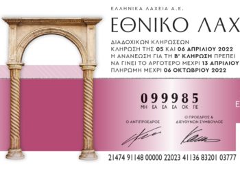 ΕΛΛΑΔΑ Διαθέσιμοι οι λαχνοί της νέας έκδοσης του Εθνικού Λαχείου – 1.000.000 ευρώ στον Μεγάλο Λαχνό και ενδιάμεσα κέρδη με μόνο 4 ανανεώσεις 15/06/2022 - 2:33μμ